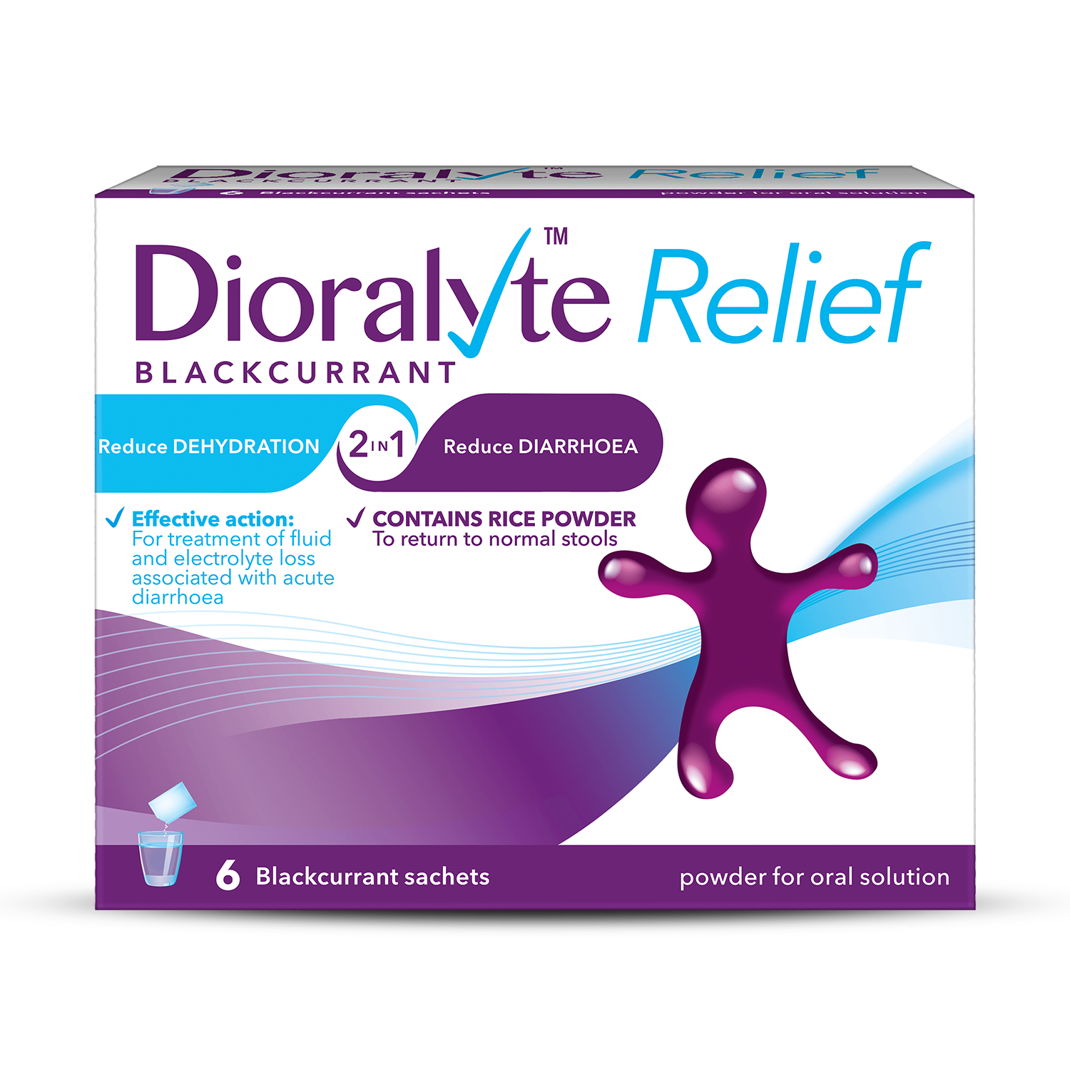 - Each sachet of Dioralyte Relief contains the right balance of essential electrolytes for your body’s wellbeing and rice starch (carbohydrates) that helps to harden your stools and reduce your diarrhoea